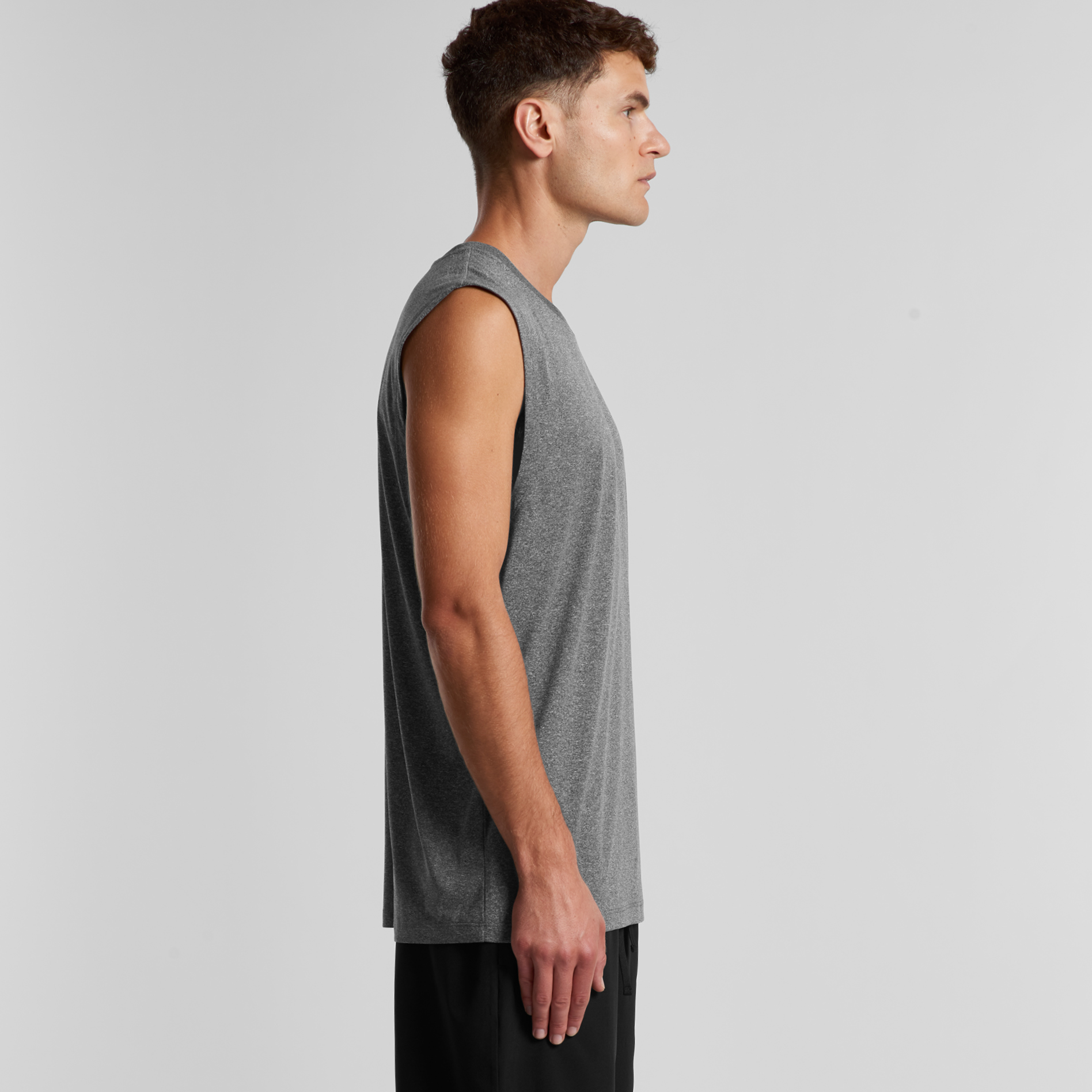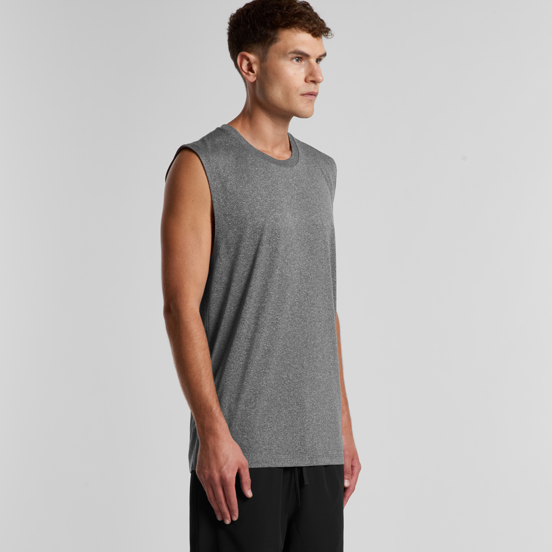 Neck ribbing, side seamed, shoulder to shoulder tape, double needle hems, moisture wicking, quick drying, suitable for low to medium impact activities